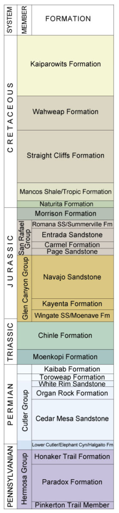 The geology of Glen Canyon is a story spanning hundreds of millions of years, displaying a continuous sequence of rock layers that range from Pennsylvanian (~320 million years old) to Late Cretaceous (~66 million years old) age. The oldest exposed rock layer, the Pennsylvanian-age Hermosa Group, lies at the base of this geological sequence and is exposed on the flanks of the Monument Upwarp on the northeast end of the lake. Above the Pennsylvanian–Permian-age Cutler Group lies the Early Triassic-age (~250 million years old) Moenkopi Formation, which is visible on both the northernmost and southernmost areas of Glen Canyon National Recreation Area. Overlying the Moenkopi is the Middle to Late Triassic-age (~230 million years old) Chinle Formation, known for its vibrant colors and abundant petrified wood.