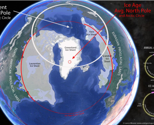 Click on the link to see my Ice Age visualization application which shows the extents of the Pleistocene polar ice sheets in a 3D interactive experience. Slide the time slider to see the ice sheet extents though time as well as the theorized track of the north pole. Toggle on & off current & ancient latitude lines as well as an Antarctica overlay. Note the geometry of the ice sheets suggests an ice age north pole centered over Greenland.