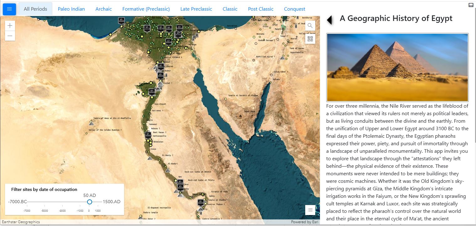 Use this interactive Map to explorer the archaeological sights of Egypt and the Near East. It’s under heavy construction for Old World sites (the N. American Sites are complete). Slide the time-slider to animate the map showing sites as they are settled and abandoned. Storymap like this one coming soon.