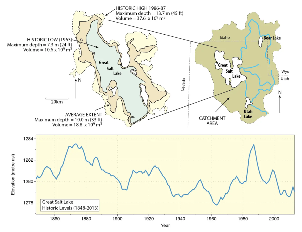 In recent years, the Great Salt Lake has again reached levels that match or slightly exceed the lows of 1963. While this is a significant hydrological event, the framing of these levels by modern media outlets and environmental organizations often borders on the sensational. By focusing exclusively on a 20- or 30-year window, these outlets frequently present current conditions as “unprecedented” or a “looming collapse” that has never occurred before.