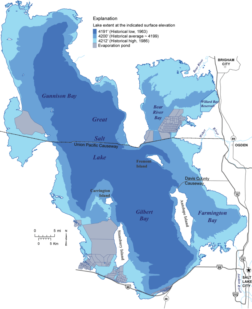 The Great Salt Lake, located in the northern part of the U.S. state of Utah, is the largest saltwater lake in the Western Hemisphere and the eighth-largest terminal lake in the world. As a terminal lake, it has no outlet; water leaves only through evaporation, leaving behind concentrated minerals and salts. It is a remnant of the prehistoric Lake Bonneville, which at its peak covered roughly 20,000 square miles of western Utah and reached depths of 1,000 feet.