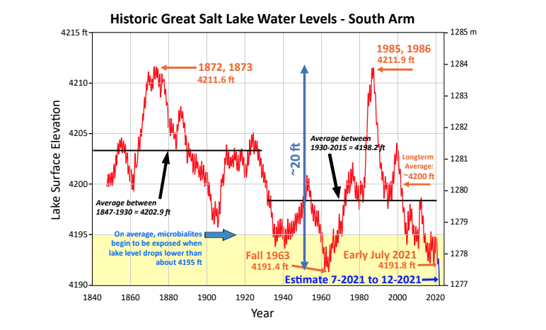 Recently the New York Times did an article on the Great Salt Lake, titled “The Great Salt Lake Is Drying. Can Utah Save It?” In this piece of propaganda disguised as a scientifically based article, they showed a chart of “historic levels of the Great Salt Lake”, which misleadingly started in 1980’s at the lakes historic high stand and ended in the present levels. The chart, much like the article purposefully left off any mention of how lake levels just a few decades prior to the 1980’s were just as low as those today. Misleading uninformed readers into thinking climate change had caused some sort of unprecedented crisis. I was informed of this article by several worried readers, who bought the propaganda and wondered what was to be done? As a start, I want to share the following information to decisions can be based on a balanced view of the past instead of propaganda.
