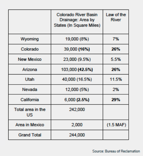 The following table illustrates the disparity between water contribution, administrative withdrawal figures, and the actual agricultural land footprint within the Colorado River Basin.