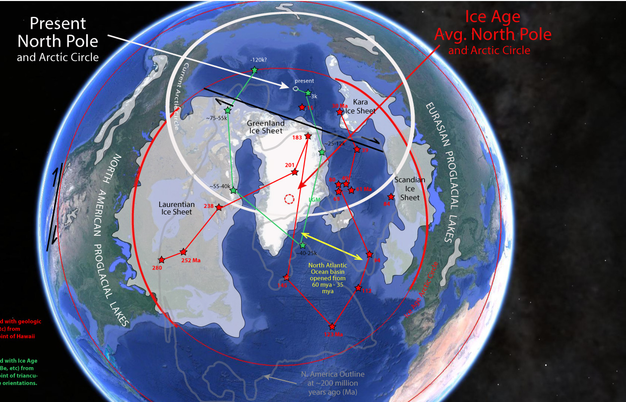 This is quite impressive and graphics very clearly presented. The idea that the Earth’s Pole may have shifted is not new. In about the 1680’s Edmund Halley suggested that the North Pole could have been in or near Northern Greenland. Halley had spent time as a ships Captain plotting magnetic anomalies in the North Atlantic and noticed that the magnetic North Pole was as near to Greenland and its substantial ice fields as to the North Pole. He suggested an impact with a comet or asteroid might have substantially shifted the Earth’s geographical Poles.