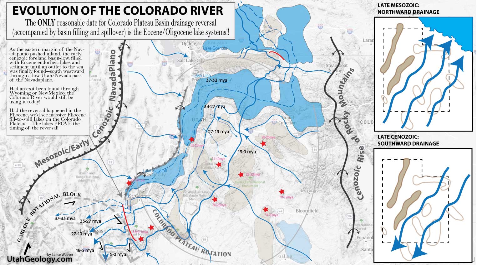 This lateral ‘pushing’ of the river from the west toward the east by eastward migrating Laramide orogenic forces can be clearly seen by the folding of Eocene and Oligocene (and even early Miocene) deposits in central Utah. The steeply folding early Cenozoic deposits on the Wasatch Plateau as well as folding under Thousand Lakes Mountain and Boulder Mountain clearly show that folding persisted at least as late as the Signal Peak volcanic rhyolites (26-25mya) which blanket Boulder Mountain. These eastward migrating fold belts would have pushed the proto-Colorado river from the location of its initial inception (in the center of the filled Eocene lake Unita & Flagstaff) to it its current location between the dates of around 35mya and 21 mya as constrained by period Oligocene lakes STOPPED retaining sediment (~35mya) to the time that the Signal Peak Volcanics and Henry Mountain laccoliths were emplaced.